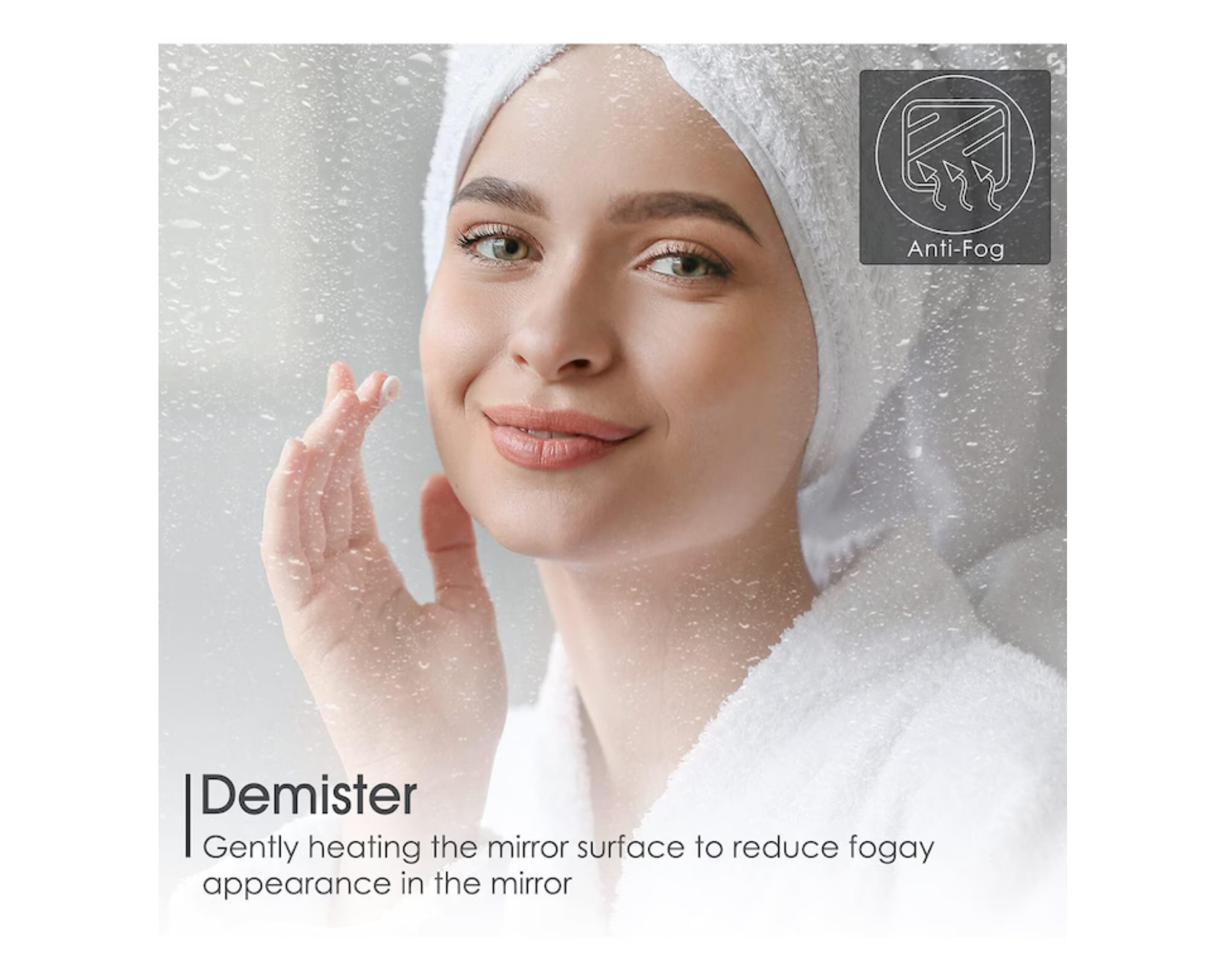 Datorita functiei TOUCH, oglinda se deosebeste simtitor fata de cele clasice. Folosind o atingere delicata asupra butonului aflat pe suprafata oglinzii, poti pune in functiune sau poti opri LED-urile de pe marginile sale. Totodata, tinand apasat butonul touch, ai posibilitatea si de a regla intensitatea luminii pe care LED-urile o emana. De asemenea, folosind functia de dezaburire (ce se aseamana cu cea prevazuta pe majoritatea lunetelor automobilelor), vei avea parte de suficienta claritate chiar si in momentele in care densitatea aburului din camera este ridicata.