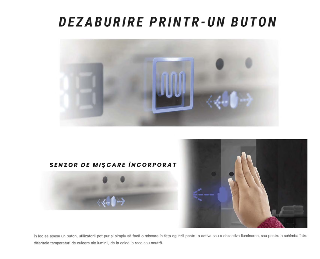 Datorita functiei TOUCH, oglinda se deosebeste simtitor fata de cele clasice. Folosind o atingere delicata asupra butonului aflat pe suprafata oglinzii, poti pune in functiune sau poti opri LED-urile de pe marginile sale. Totodata, tinand apasat butonul touch, ai posibilitatea si de a regla intensitatea luminii pe care LED-urile o emana. Folosind functia de dezaburire (ce se aseamana cu cea prevazuta pe majoritatea lunetelor automobilelor), vei avea parte de suficienta claritate chiar si in momentele in care densitatea aburului din camera este ridicata.