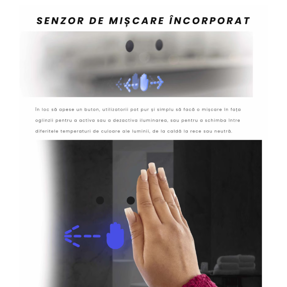 Datorita functiei TOUCH, oglinda se deosebeste simtitor fata de cele clasice. Folosind o atingere delicata asupra butonului aflat pe suprafata oglinzii, poti pune in functiune sau poti opri LED-urile de pe marginile sale. Totodata, tinand apasat butonul touch, ai posibilitatea si de a regla intensitatea luminii pe care LED-urile o emana. Folosind functia de dezaburire (ce se aseamana cu cea prevazuta pe majoritatea lunetelor automobilelor), vei avea parte de suficienta claritate chiar si in momentele in care densitatea aburului din camera este ridicata.